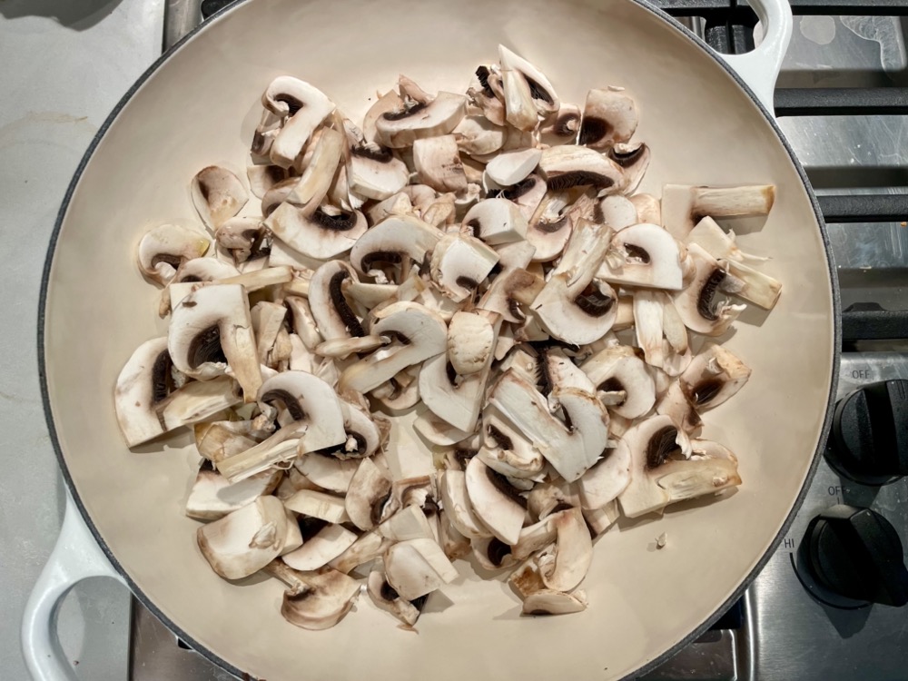 Cook the mushrooms: In the same skillet on MED heat, add a drizzle of olive oil and sauté the sliced mushrooms with a pinch of salt and pepper until cooked (5 minutes). Remove the cooked mushrooms into a bowl and set aside until ready to use.