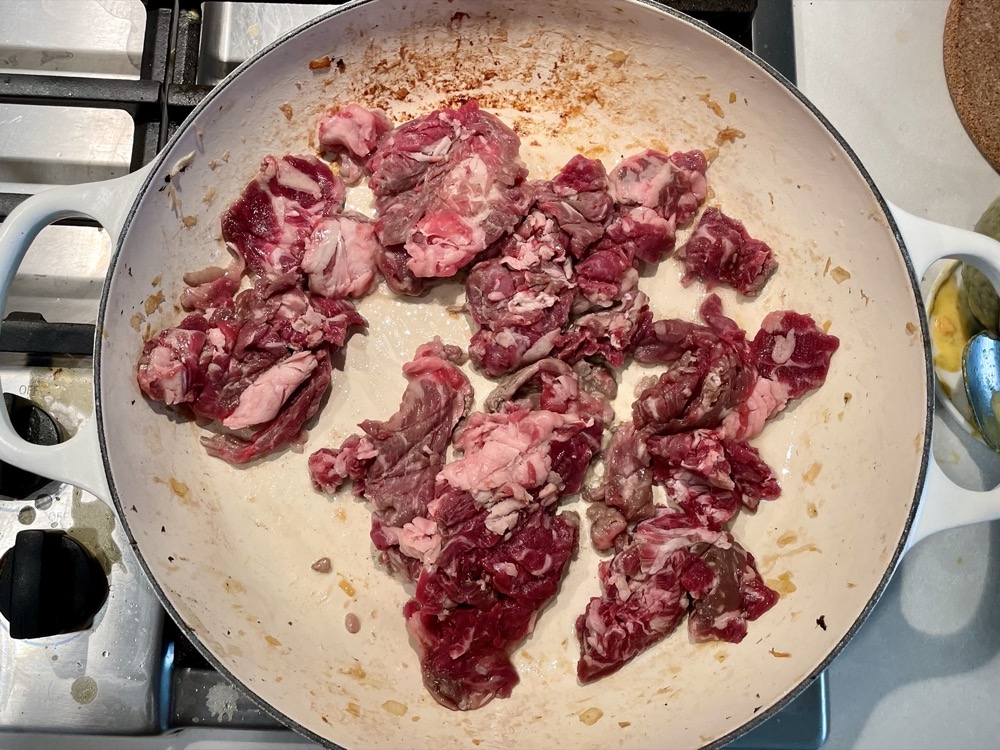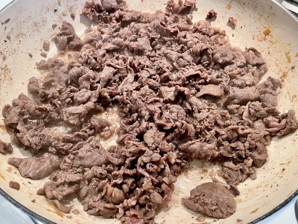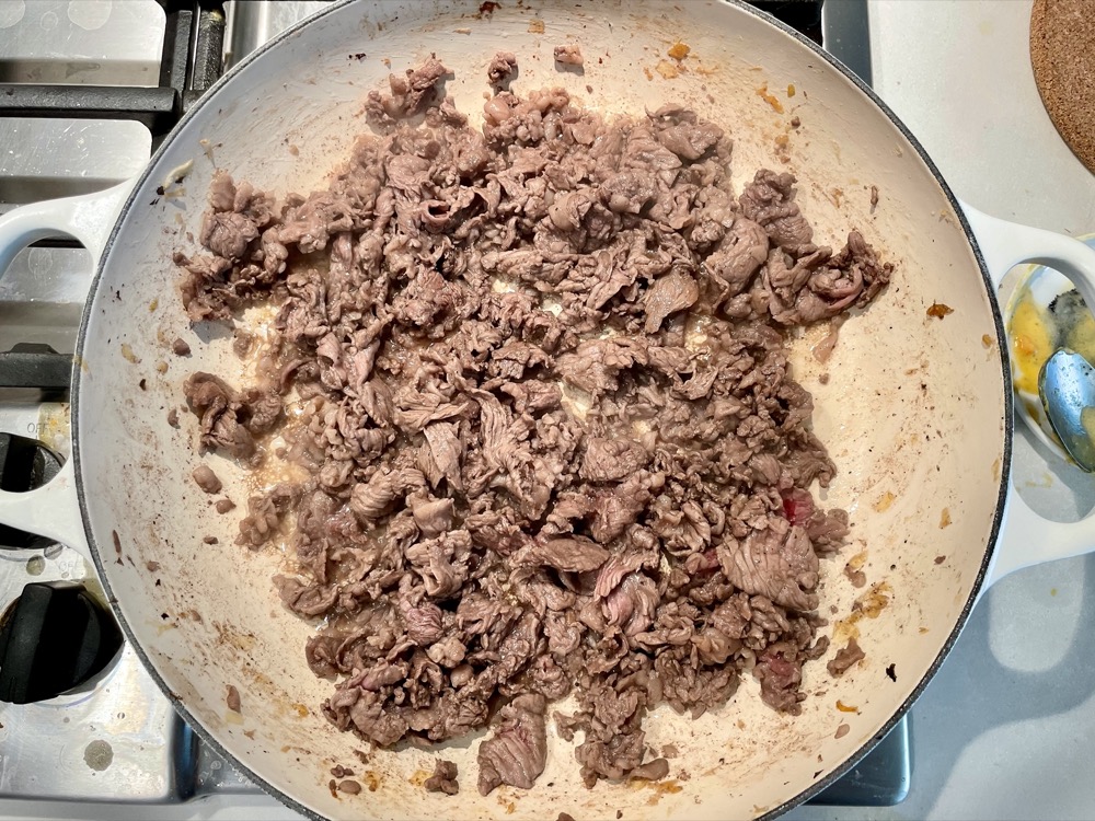 4. Cook the steak: In the same skillet on MED heat, melt another 1 Tbsp of bacon fat and add in the rib eye steak slices. Add a pinch of salt and fresh ground black pepper and continue to sauté until the steak is fully cooked (~5 minutes). Taste and adjust salt and pepper as needed. Turn the heat off.