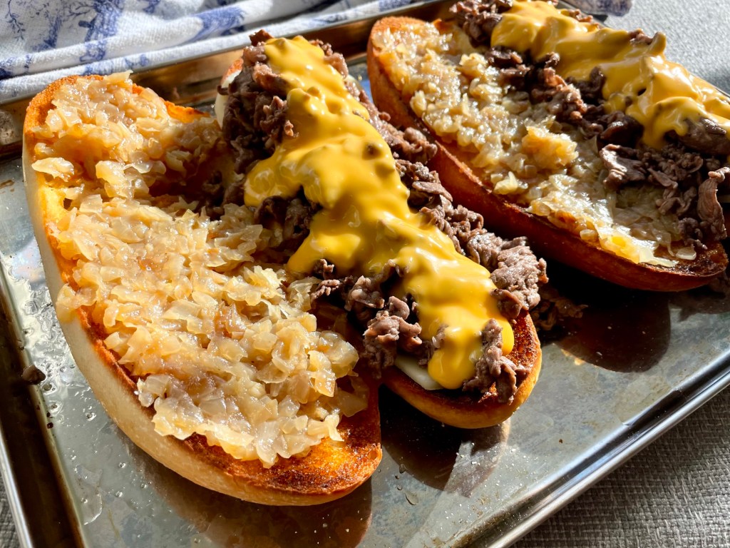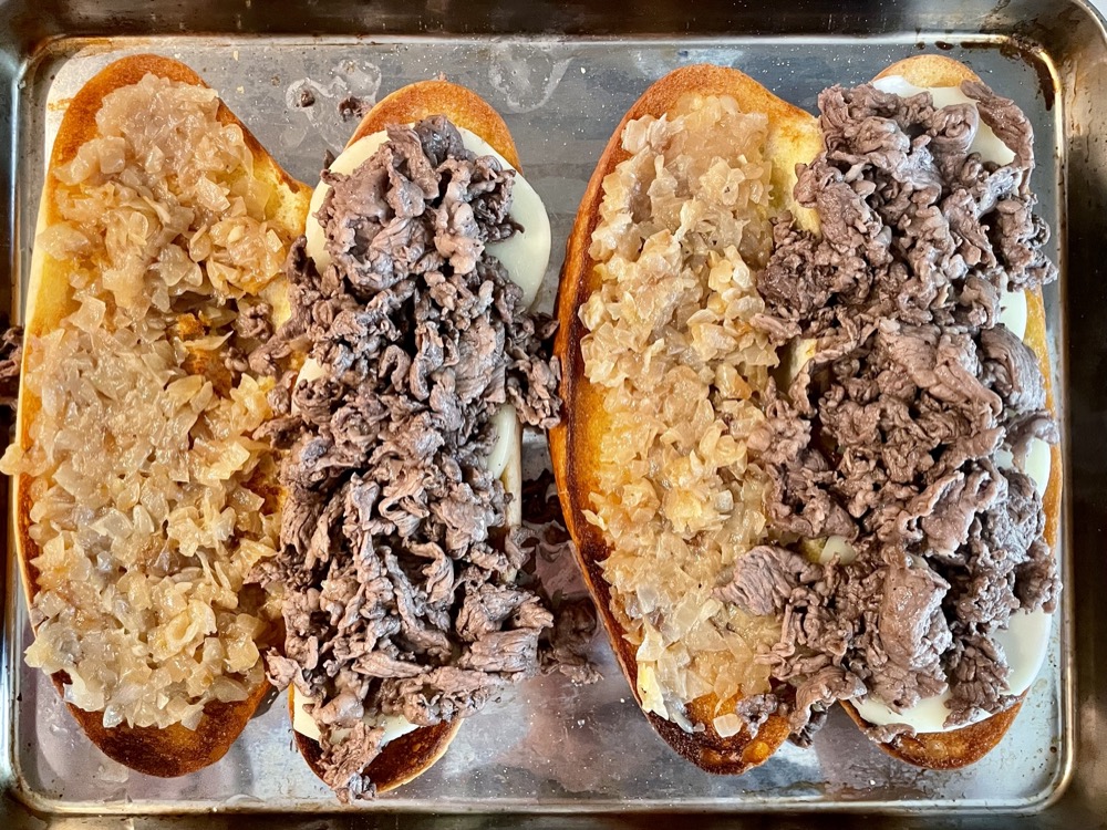 Usually the bread is not toasted in a traditional cheesesteak, but for my recipe I’ve done a quick broil in the oven so the bread gets a little more crunch to hold up to the moisture of the beef a little better.