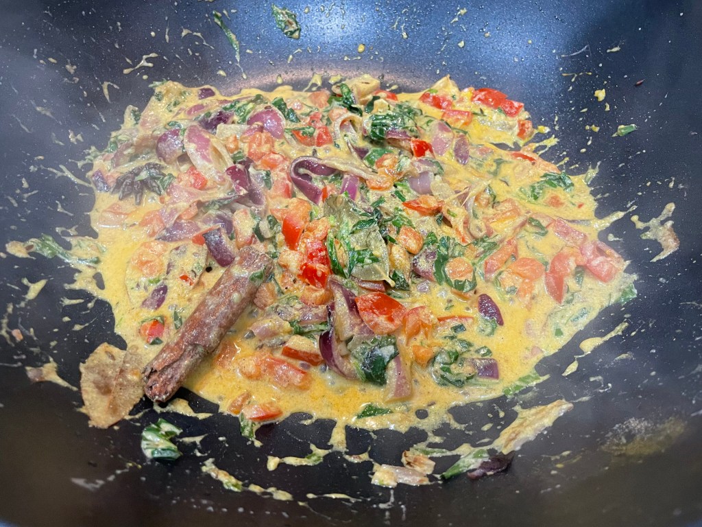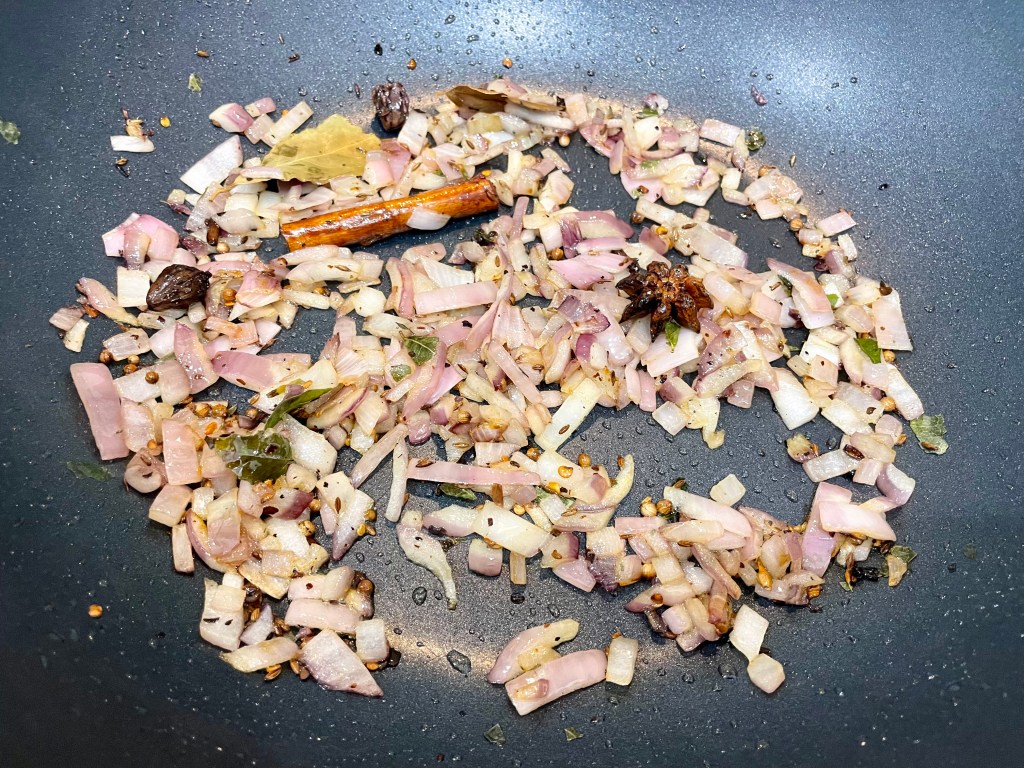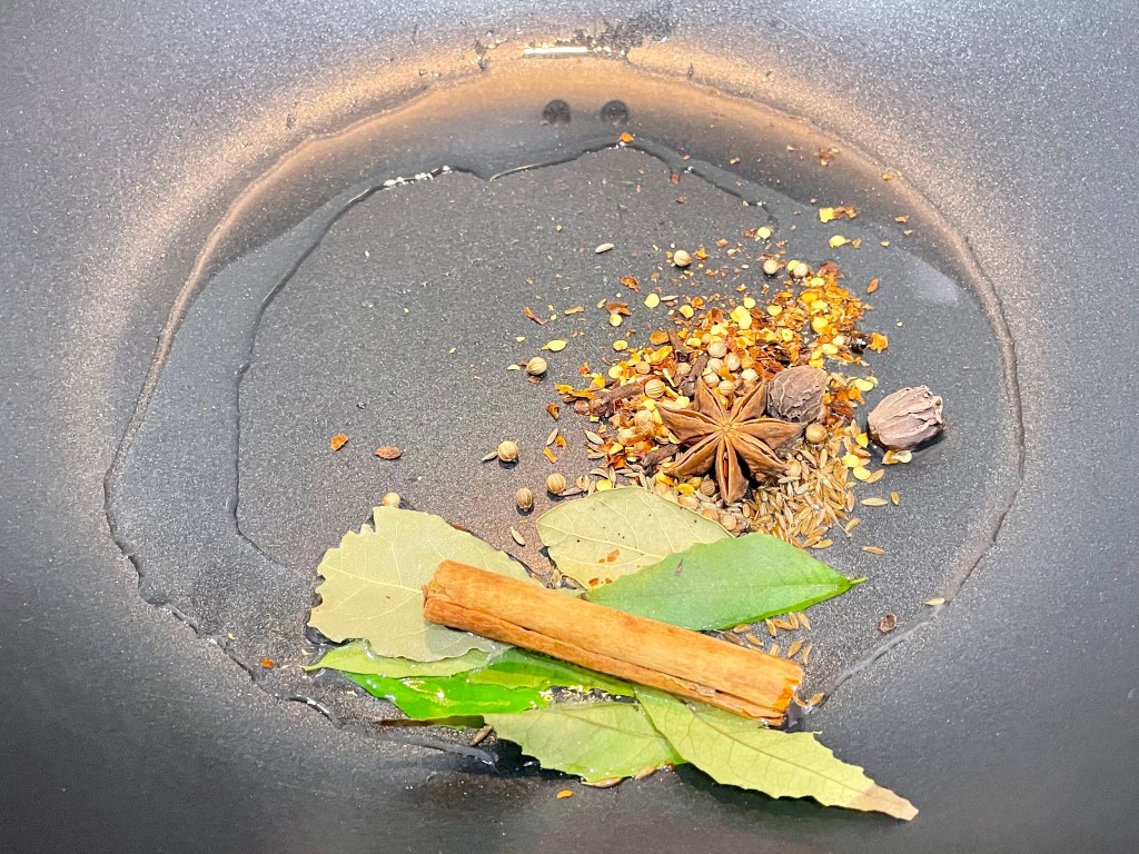 2. Heat up a medium pot or pan on MED-HIGH heat and add in the oil. Next add in the spice mix (2 bay leaves, 6 cloves, 6 cardamom, 1 star anise, 1/2 tsp cumin seeds, 1 cinnamon stick, 1 tsp chilli flakes, 1/2 tsp coriander seeds, 6 curry leaves). Sauté the spices in the oil until the cumin seeds start to sputter (~5 mins).