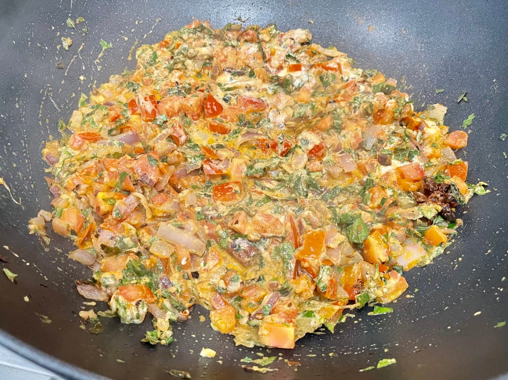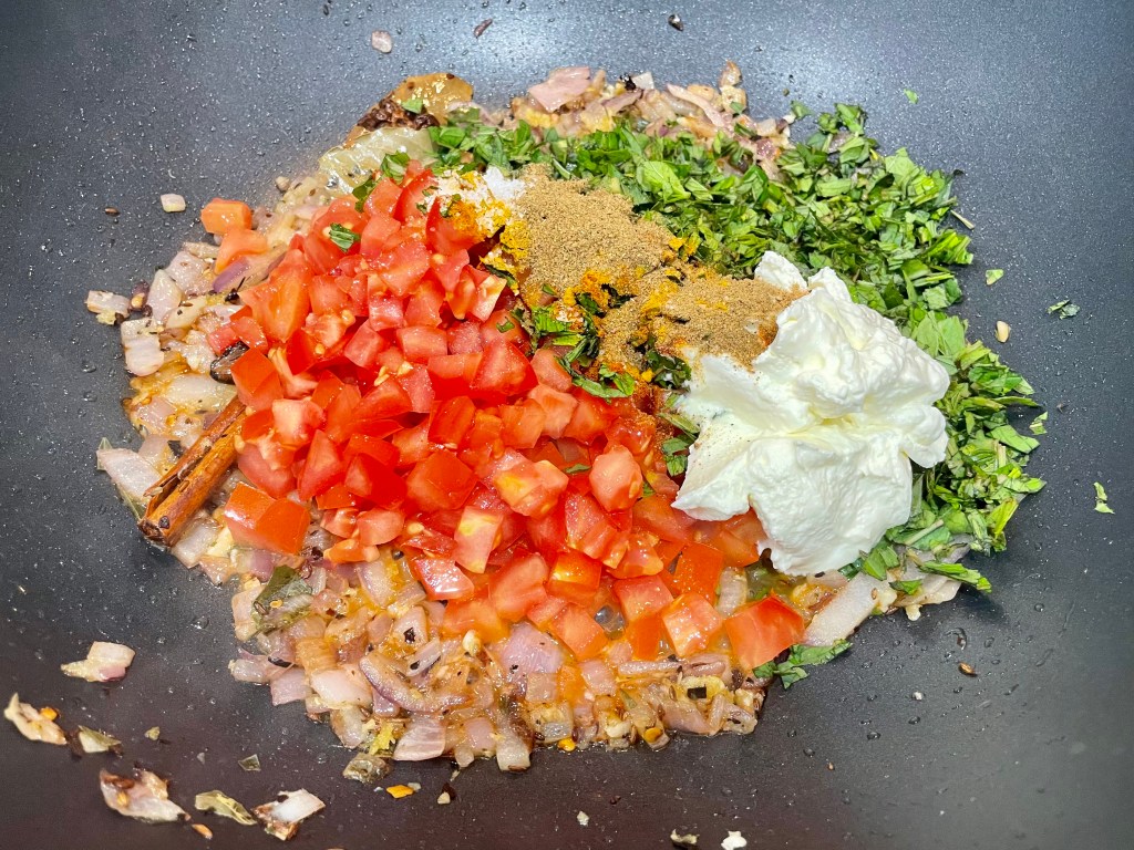 5. Next add in the tomatoes, 1/4 cup plain yoghurt, 1/2 tsp salt, 1.5 tsps garam masala, 1/4 tsp turmeric, 1 tsp paprika, and handful of mint leaves. Stir to combine and continue to sauté until the tomatoes break down and you end up with a thick mushy paste (~5-8 mins).