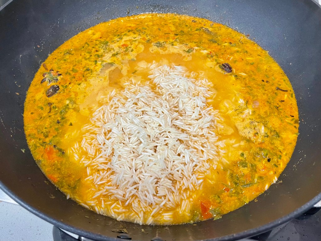 6. Once you have a mushy paste, pour in the 3.5 cups of chicken stock and mix. Turn the heat up to HIGH and once the liquid boils, add in the drained basmati rice and mix. Turn the heat down to MED and let the rice simmer uncovered until the liquid is nearly gone (~10-15mins – see photo) then turn the heat to LOW and put a lid on the rice to steam for a further 5-10 mins until fully cooked, then turn off the stove. Taste and adjust salt as needed. Fluff up the rice and Serve!