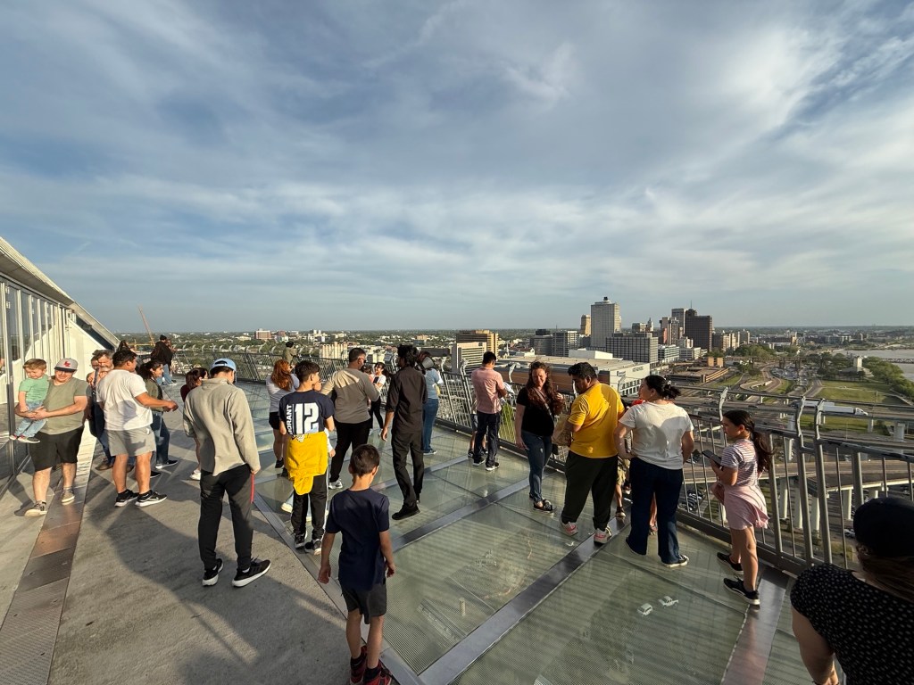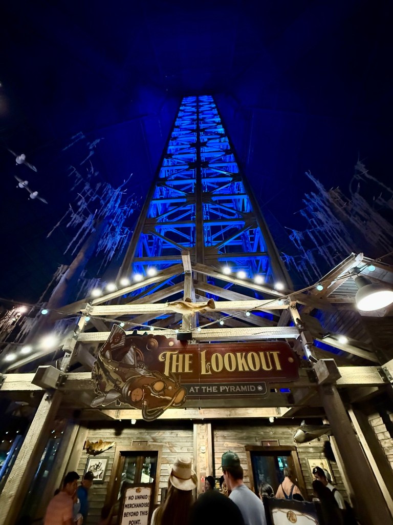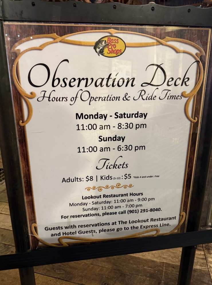 In the middle of the pyramid is the tallest free-standing elevator in the US and stands 28 stories/300 feet high. It costs $8 to go up and at the top it opens into a restaurant with an outdoor observation deck with sweeping views of downtown Memphis and the Mississippi River. The line can get pretty long, but it moves quickly. Definitely worthwhile to go up for the price!