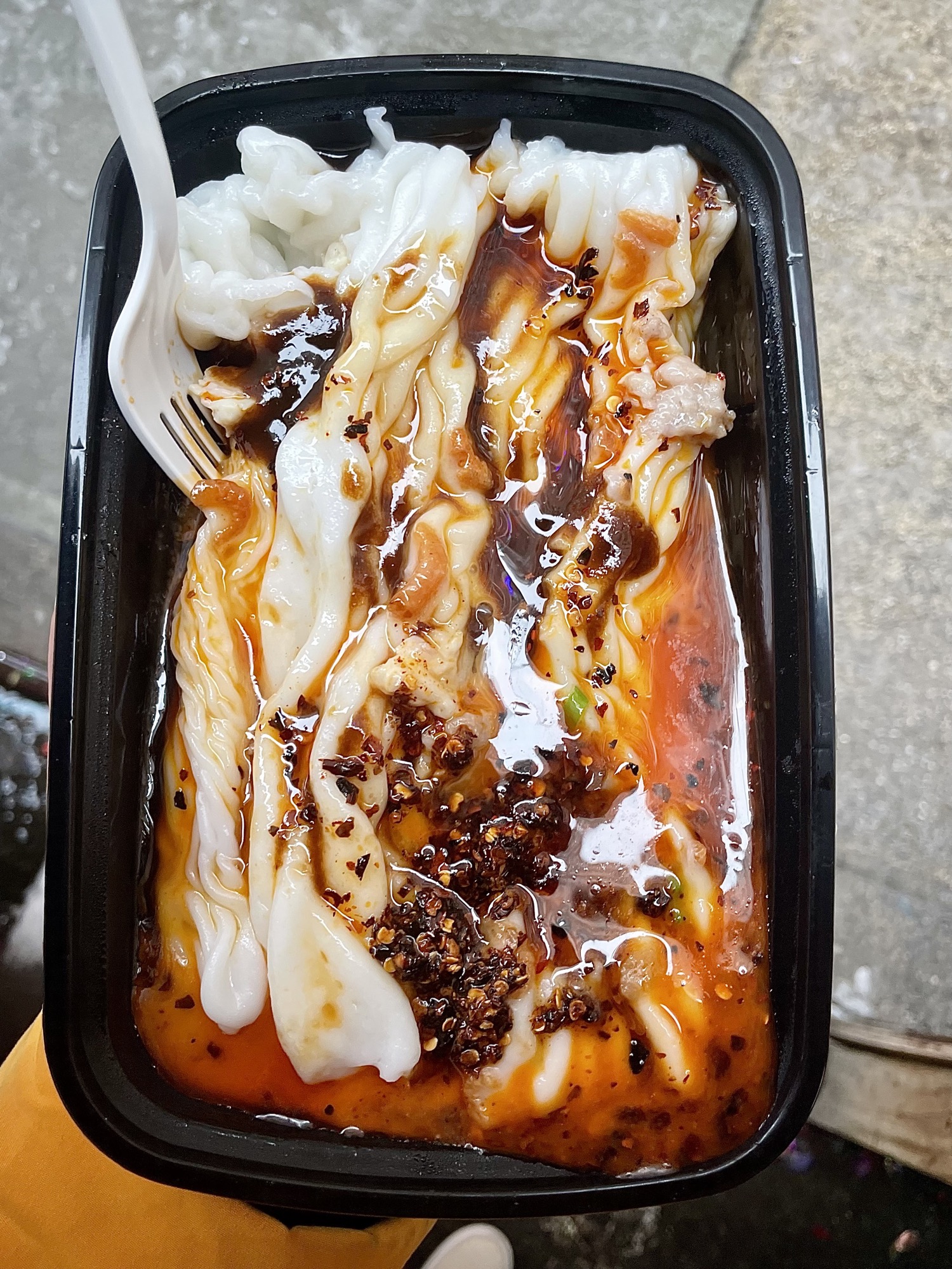 ChangFun or rice noodles are something I’ve only ever had at dim sum places. It’s usually a rolled up long white noodle dish with a protein wrapped inside and soy sauce drizzled overtop. I had never had fresh rice noodles until coming to New York and Tonii’s (yes, with 2 i’s) blew my mind! At first glance, this hole-in-the-wall shop has no seating and the inside looks a bit suss. There’s a crappy half-fallen down outdoor area with a couple of old chairs and tables that you can maybe clean off yourself if you want to sit and eat, but all the food is packaged as takeaway. I was skeptical, but upon first bite, I was in love! The fresh rice noodles here are so much softer than any dim sum place I’ve ever had. They offer a few different protein options, but their most popular (and my favourite) is the ‘Tonii’s special’ which has pork, chicken and dry shrimp. The rice noodles comes with 4 sauces that are packaged separately and you pour it on yourself: chili oil crisp, sweet soy sauce, hoisin sauce, and peanut sauce. I would highly recommend adding all 4 sauces and mix it all up. It’s seriously delicious and one of my favourite chinatown gems!