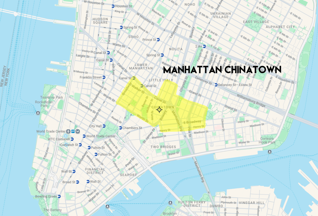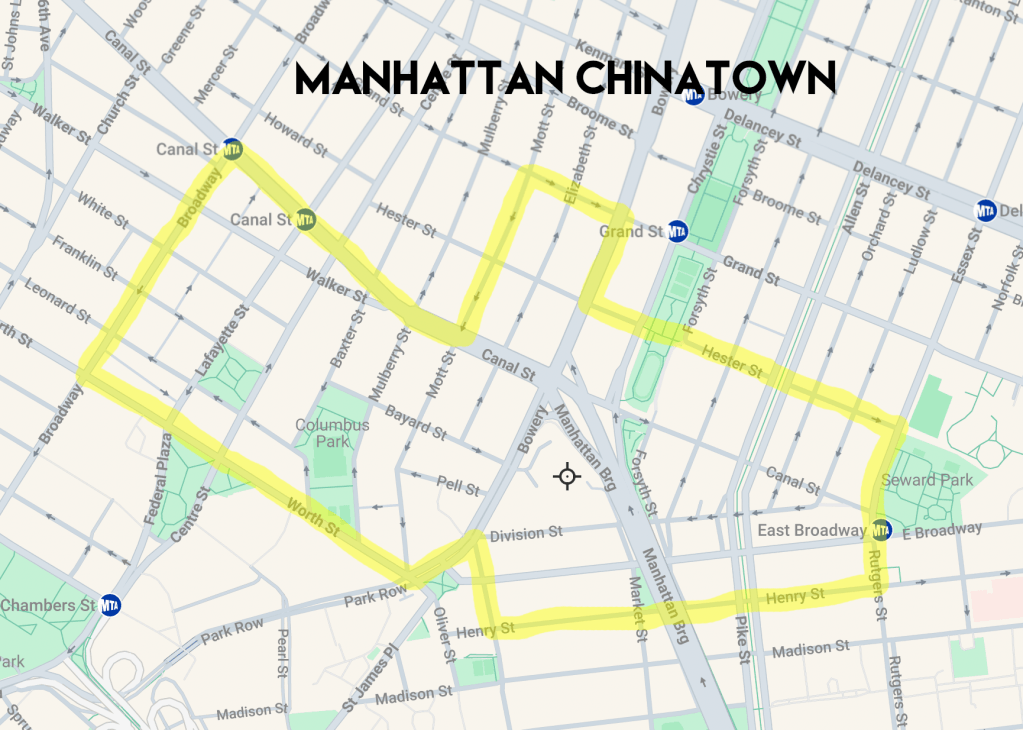 There are a few Chinatowns around NYC (ie Flushing and Bay Ridge), but there’s only one in Manhattan. A quick Google search will show you the outline of this neighbourhood that borders Little Italy. I’ve highlighted the neighbourhood in the maps below.