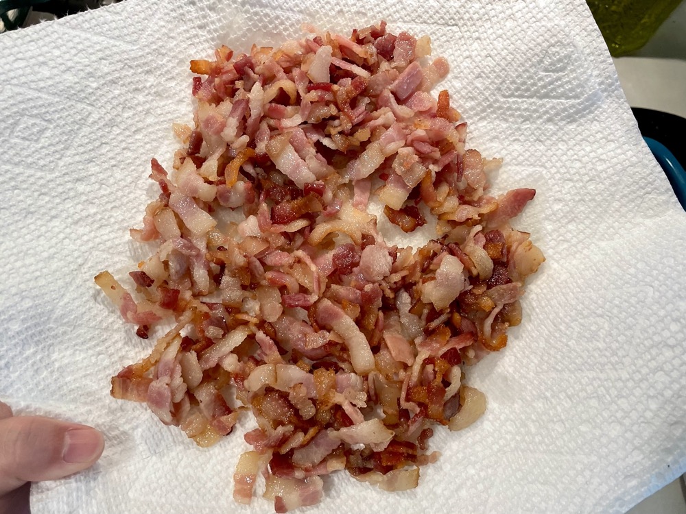 2. In a large soup pot on MED heat, add in the diced bacon and sauté until crispy (~5 minutes) then set aside onto a paper towel-lined plate.