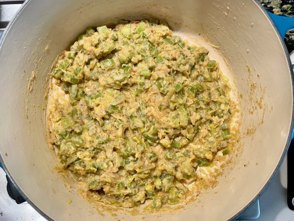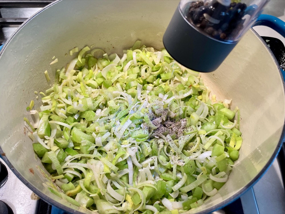 3. In the same pot, using the residual bacon grease, add in 3 Tbsps butter and stir until melted. Add in the celery, leeks, pinch of salt and pinch of black pepper. Sauté until the celery has softened (~8 minutes).