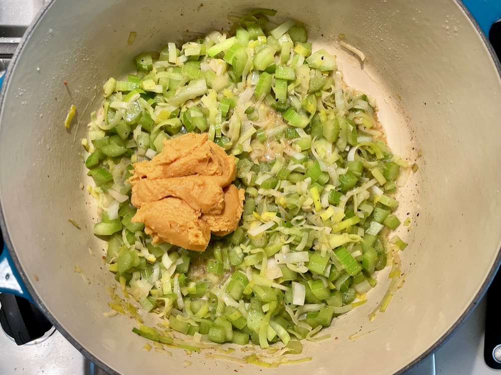 Next add in the white miso paste and mix well until there are no clumps and sauté for 3 minutes to slightly caramelize the miso.