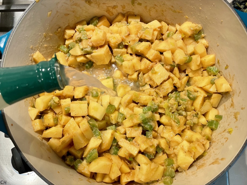 Add in the potatoes, clam juice, 4 cups water, and 2 sprigs thyme. Mix well, turn the heat on to HIGH to let the soup come to a boil, then turn the heat down to LOW and simmer until the potatoes are soft enough to break with a spoon (15 minutes).
