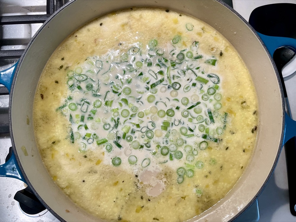 7. Stir in the corn kernels until heated through, then turn off the heat. Taste and adjust salt and pepper as needed.