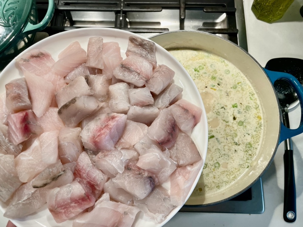 6. Add in the 1 cup heavy cream and the white part of the sliced scallions. Let the soup come to a simmer then add in the fish pieces (from step 1). Continue to simmer until the fish is flakey and cooked (~5 minutes).