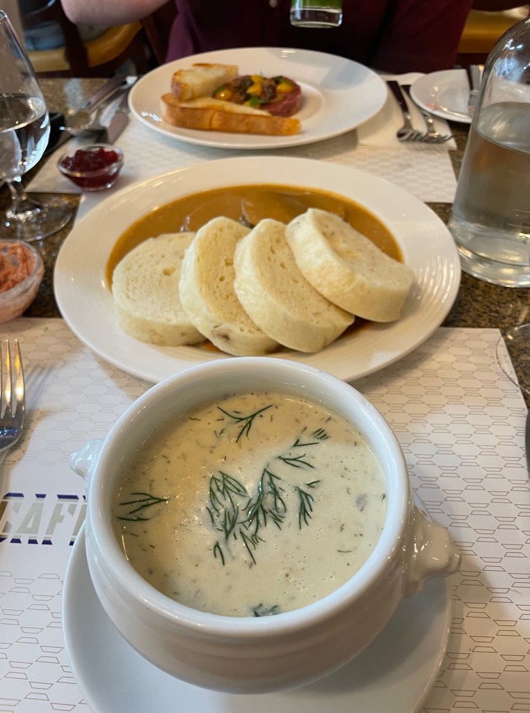 Kulajda (pronounced “koo-lie-duh”) is a creamy and tangy mushroom, dill and potato soup that is traditional to Southern Czech. We first came upon it on our trip to Prague this past summer. Apart from all the nostalgic Czech dishes that Toby wanted to have (including steak tartare), we also googled some famous must-have Czech dishes that led us to the historical Michelin-guided restaurant, Café Imperial. There were SO many delicious things at this restaurant but my all-time favourite was the kulajda. In fact, I liked it so much that I was on the lookout for it at every subsequent restaurant we went to on our trip around Czech! The flavour combination of savoury and tangy and highlighting the ingredients of mushrooms and dill were out of this world. It was a combination that was new to me and I loved it!
