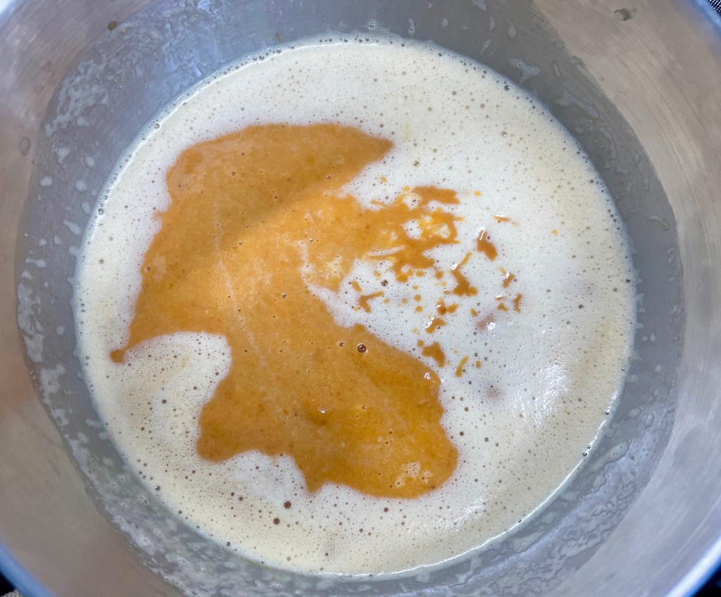 To the sugar/butter mixture, add in 1 tsp salt, and the frothed yeast mixture (from step 1).