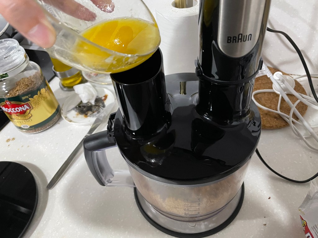Mix/pinch/squish it by hand for 2-3 minutes until you get a crumbly mixture (see photo). Set aside.