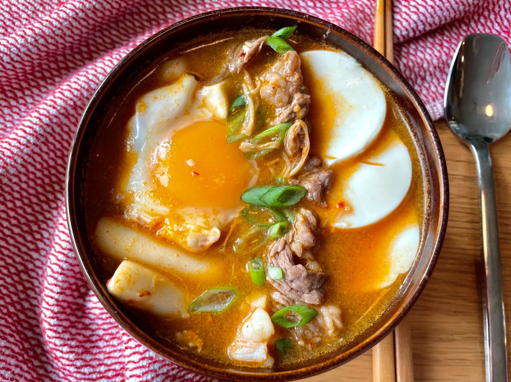 - Slice the egg tofu into 2.5cm thick rounds and place on a heat-proof plate.