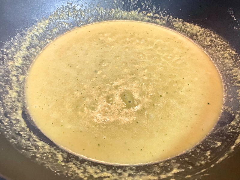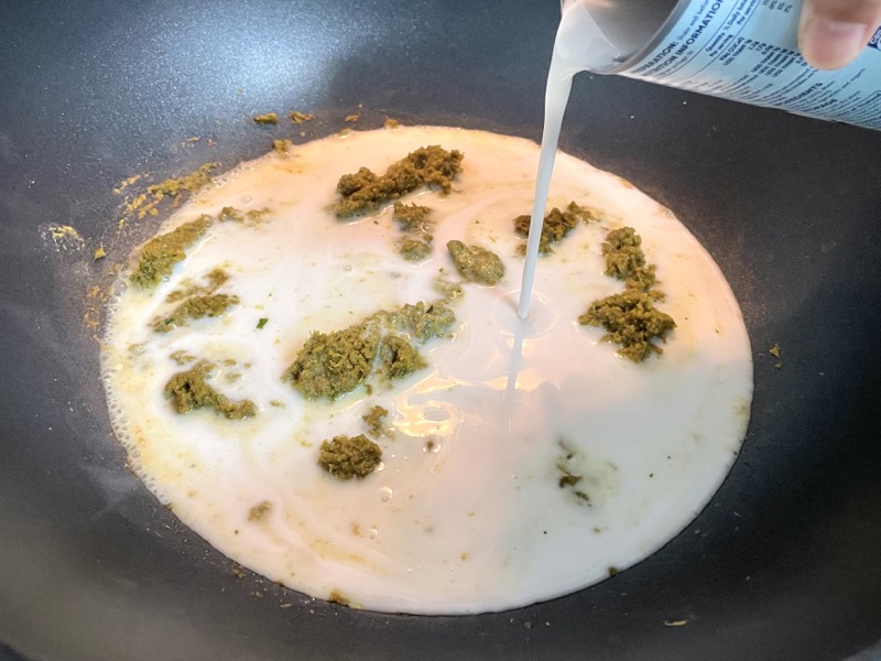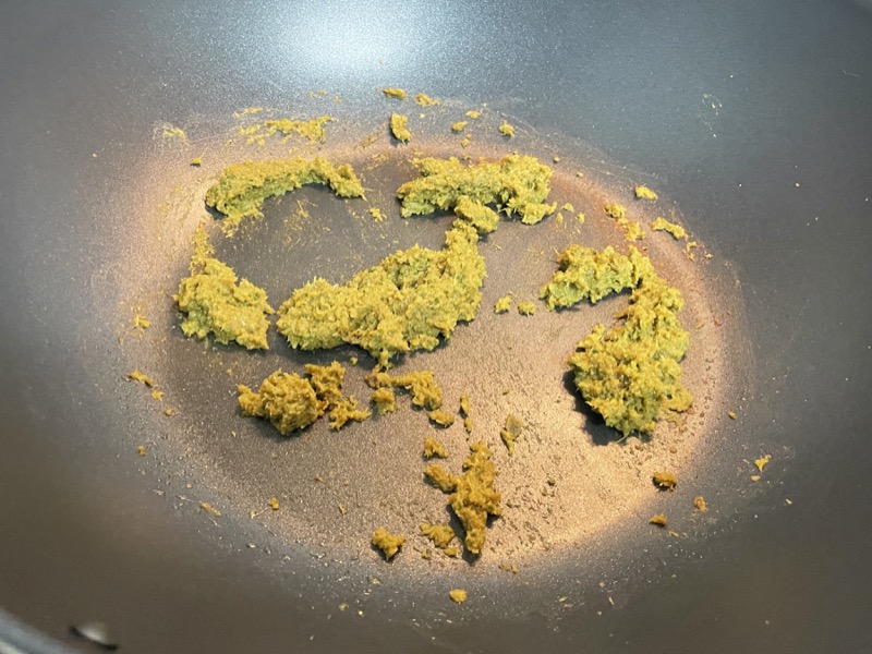 - Heat a large pan or wok on MED heat and sauté the green curry paste in a drizzle of oil until the paste dries out a bit and turns slightly brown (2-3 minutes).