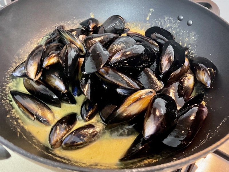 - Add in the mussels and stir. Put the lid on and let the mussels steam for 4-5 minutes until they all open up. Turn off the heat and serve!