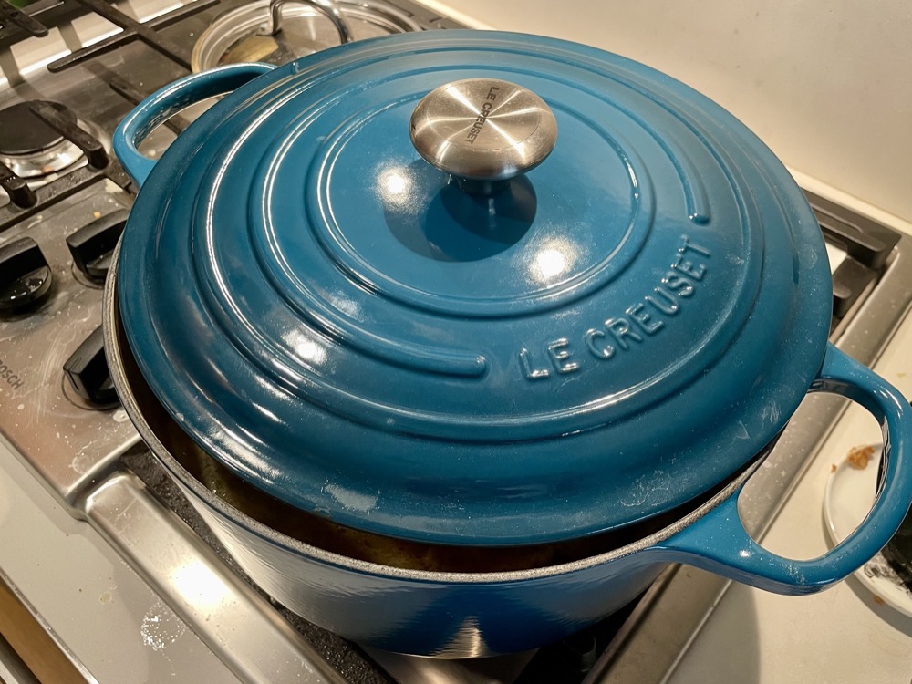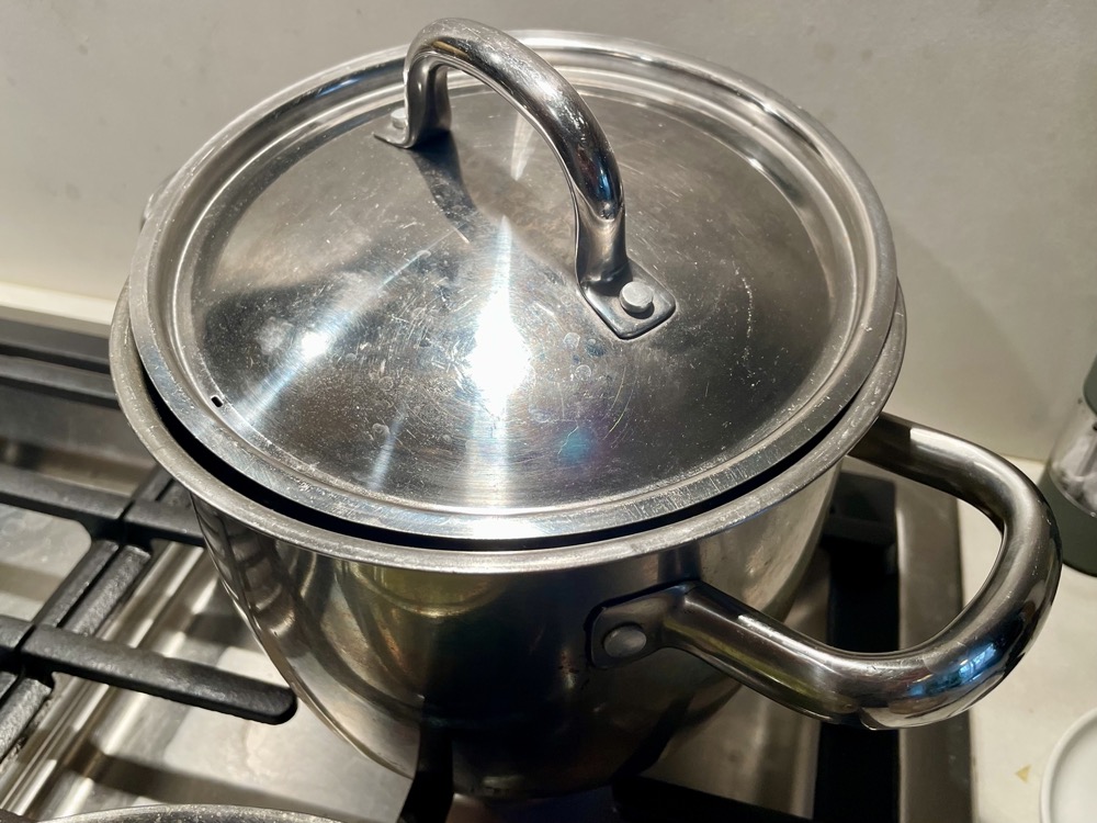 Add in the potatoes, clam juice, 4 cups water, and 2 sprigs thyme. Mix well, turn the heat on to HIGH to let the soup come to a boil, then turn the heat down to LOW and simmer until the potatoes are soft enough to break with a spoon (15 minutes).