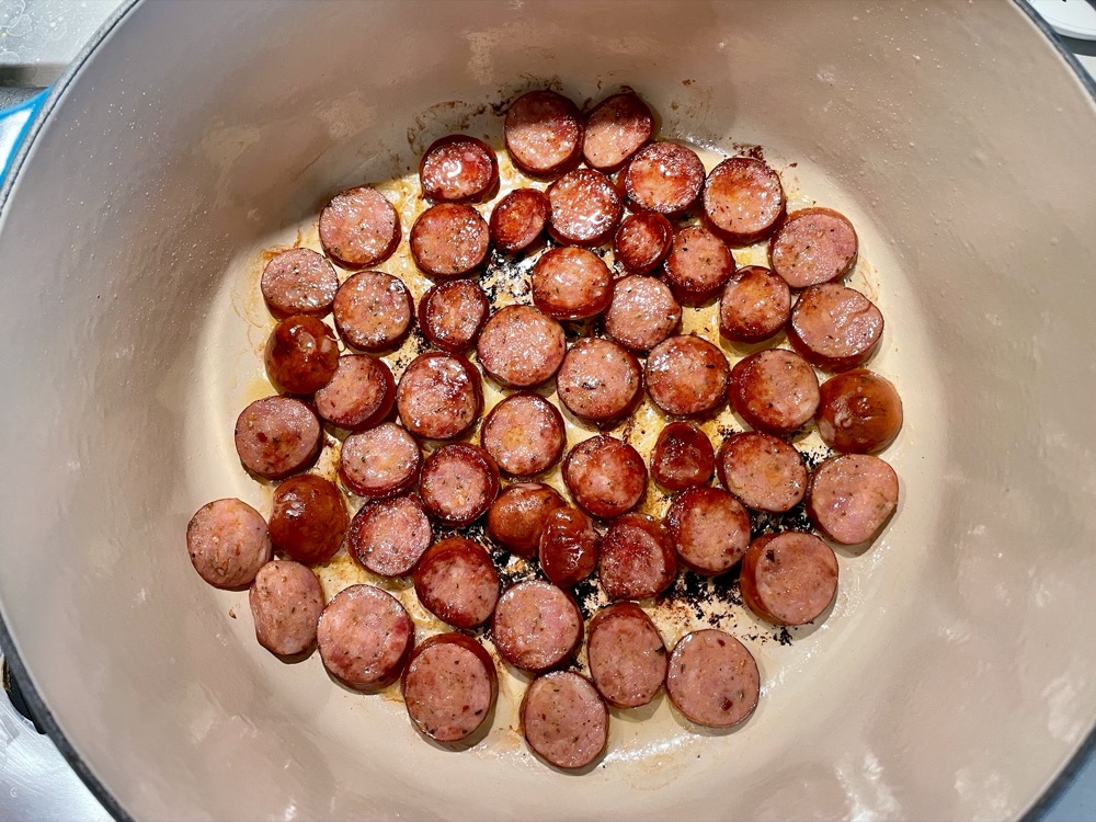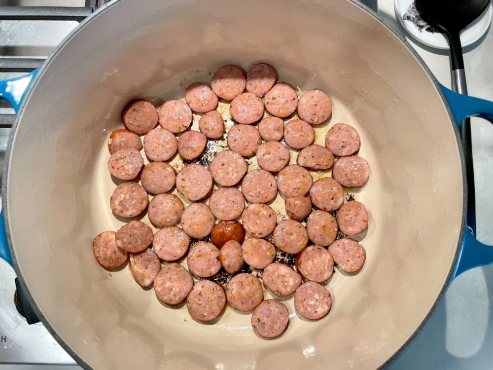 In a large soup pot on MED heat, add in the diced bacon and sauté until crispy (~5 minutes) then set aside onto a paper towel-lined plate.