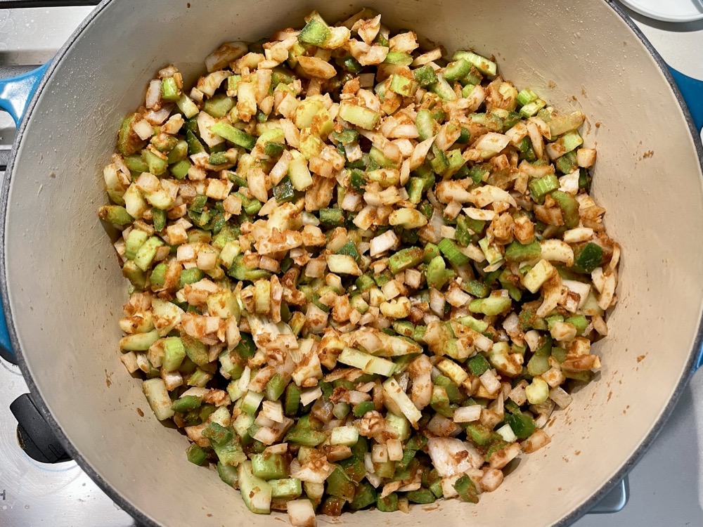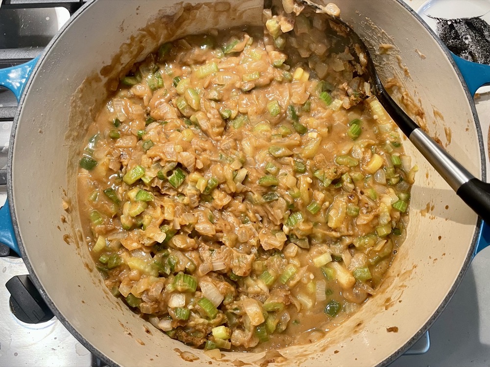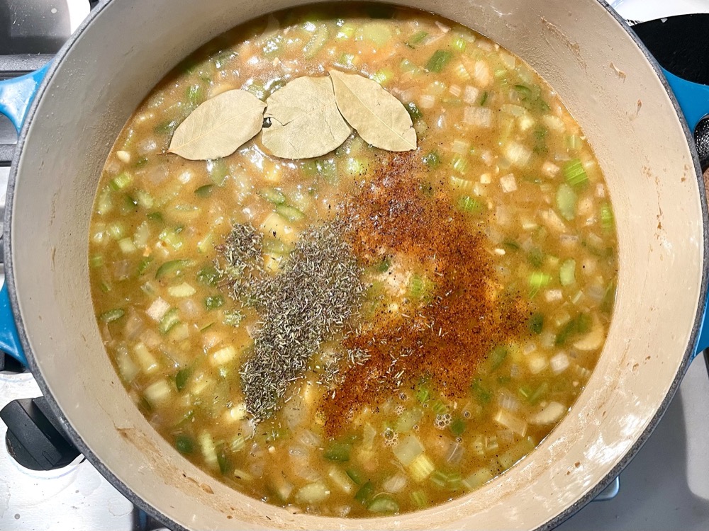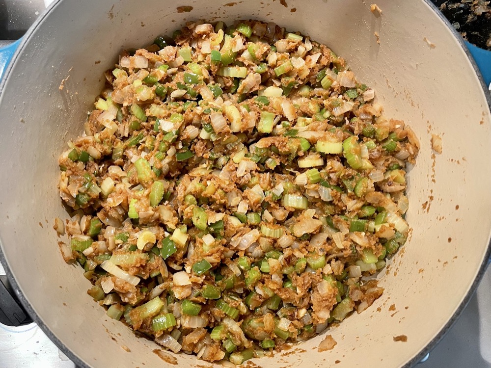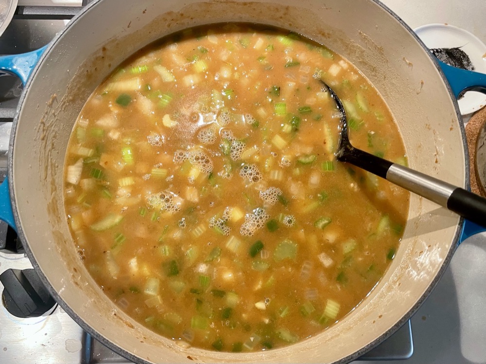 - In the same pot, using the residual bacon grease, add in 3 Tbsps butter and stir until melted. Add in the celery, leeks, pinch of salt and pinch of black pepper. Sauté until the celery has softened (~8 minutes).