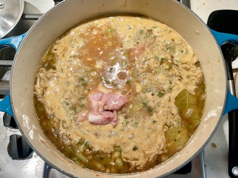 - Add in the potatoes, clam juice, 4 cups water, and 2 sprigs thyme. Mix well, turn the heat on to HIGH to let the soup come to a boil, then turn the heat down to LOW and simmer until the potatoes are soft enough to break with a spoon (15 minutes).